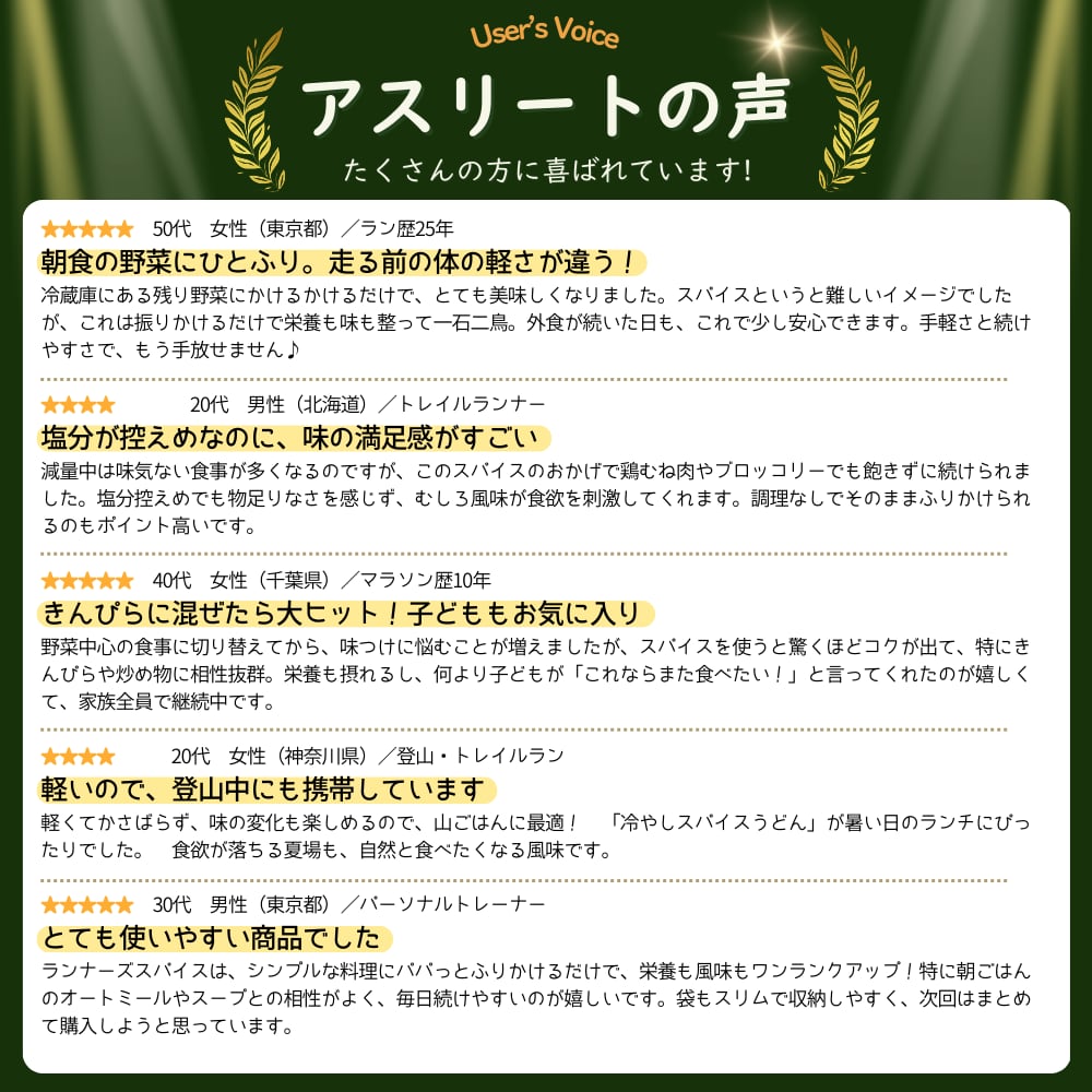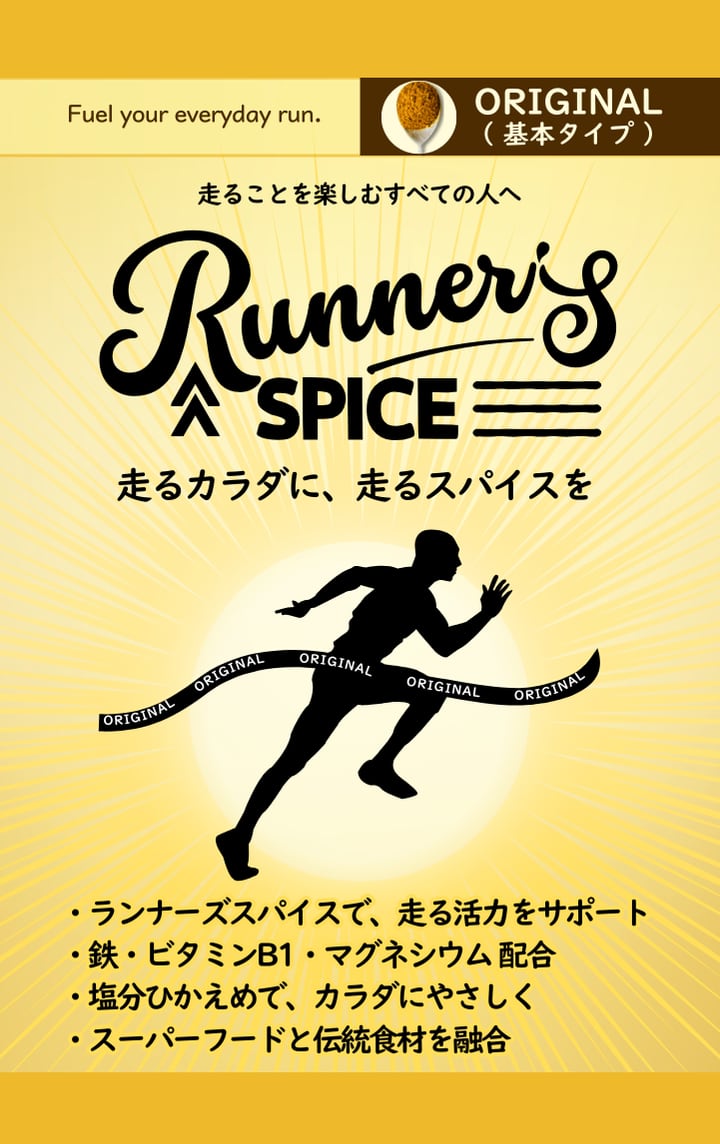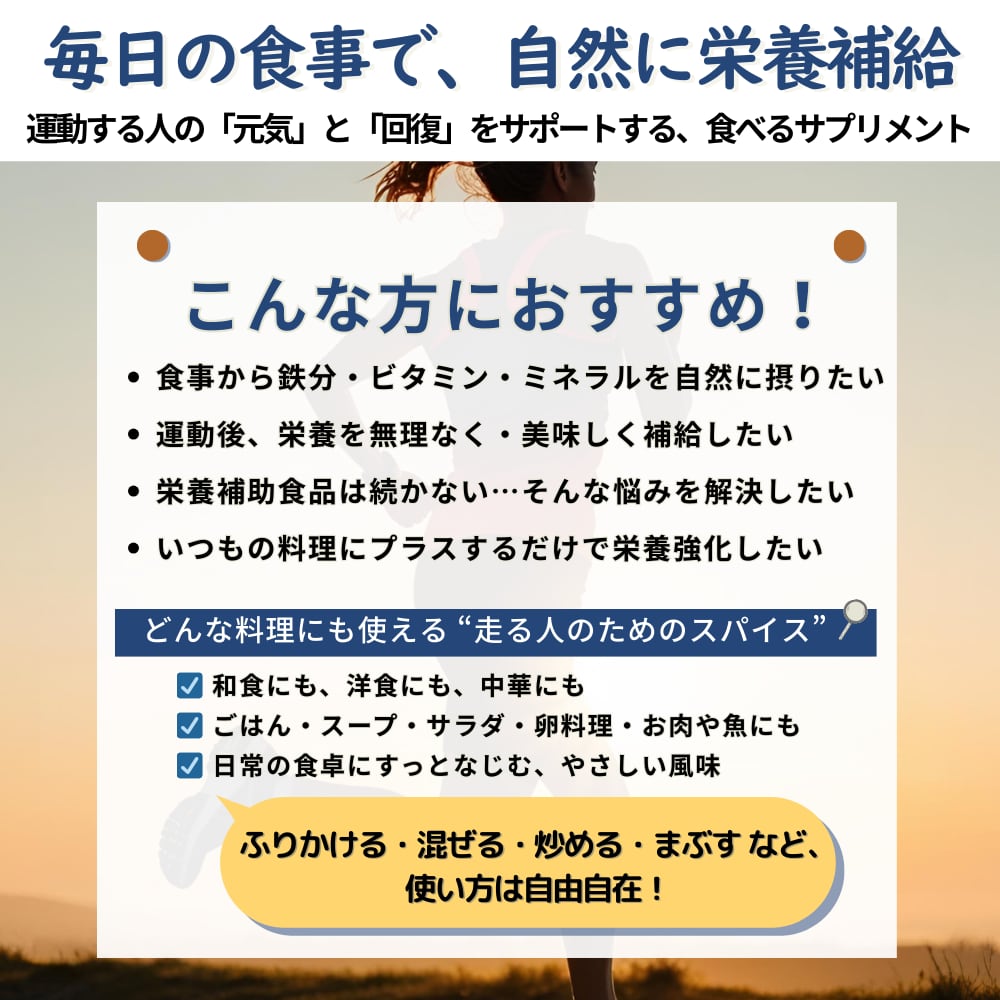 クミンやターメリック、パプリカの香りに、昆布やきなこ、ゴマのコクを加えた、毎日使える万能ブレンド。どんな料理にも合わせやすく、ランナーの「いつものごはん」を底上げします。