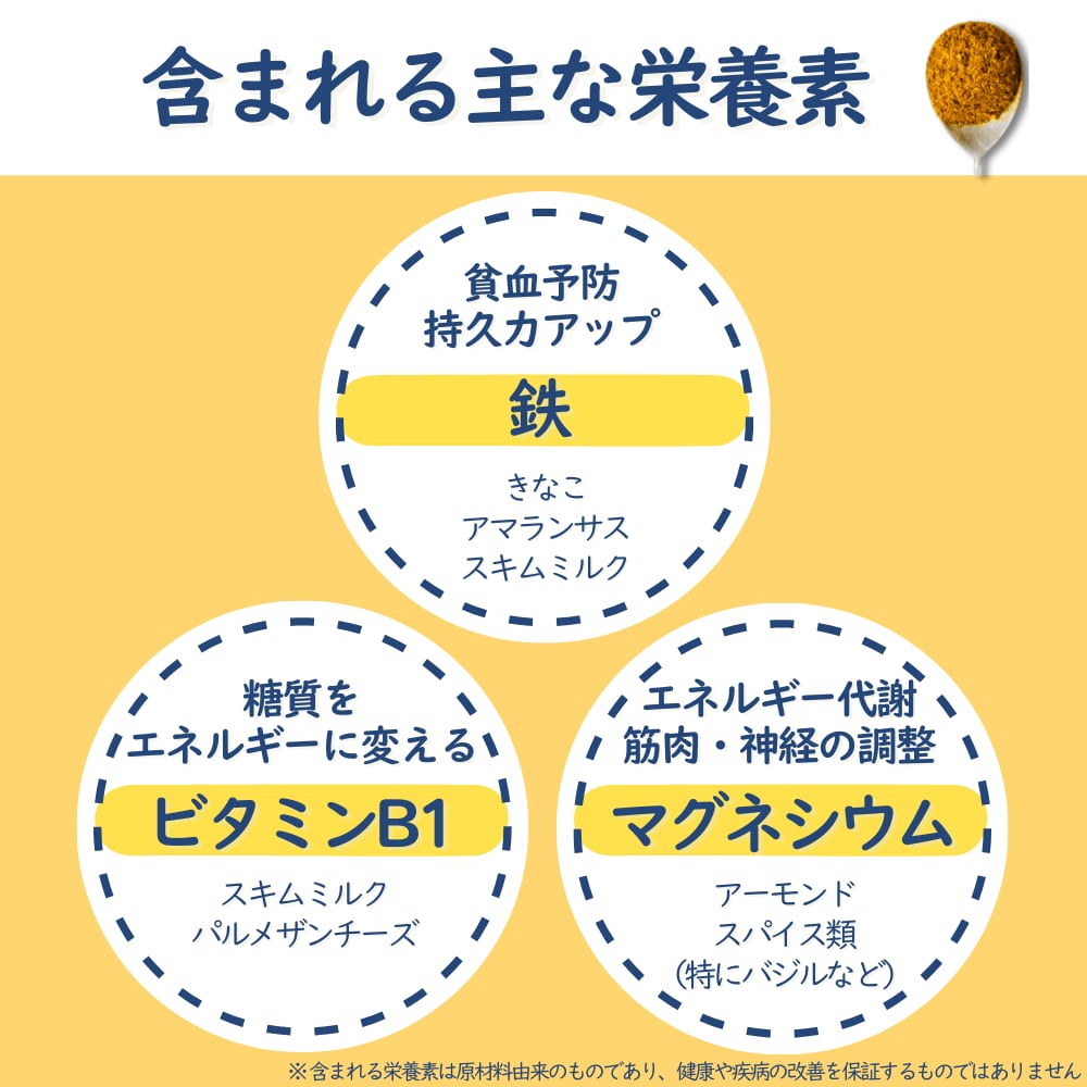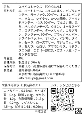 原材料:塩、オートミール、スキムミルク、パプリカパウダー、ガーリックパウダー、オニオンパウダー、きなこ、シイタケ、かつお節粉、アーモンドパウダー、ベジパウダー、てんさい糖、昆布、パルメザンチーズ、クミン、オールスパイス、コリアンダー、ターメリック、カルダモン、ジンジャーパウダー、ブラックペッパー、ホワイトペッパー、オレガノ、バジル、タイム、セージ、ローズマリー、マジョラム、パセリ、ちんぴ、セロリ、アマランサス、キヌア、クエン酸、ごま(一部に乳・ごま・大豆・アーモンドを含む)